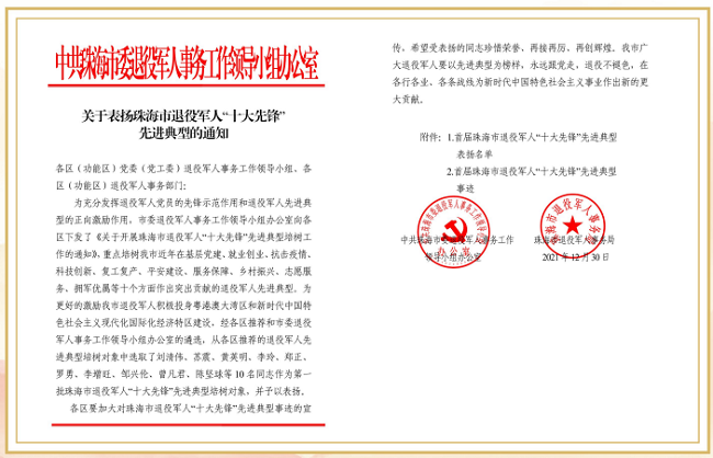 2022年4月26日,接珠海市委退役軍人事務工作領(lǐng)導小組辦公室通知,珠海聯(lián)港城市建設(shè)管理有限公司總經(jīng)...